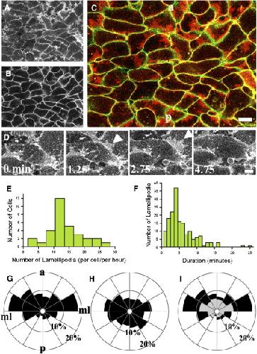 (G and H) Rose diagrams demonstrate that most lamellipodia at the surface (G) are mediolaterally oriented, as are deep cell extensions shown in (B) at the 5 μm level (H).