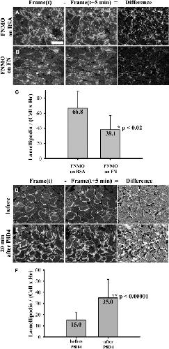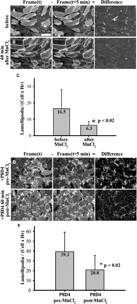 (A and B) Two frames from a representative confocal time-lapse and their calculated difference image before (A) and after (B) superactivation of integrins after addition of 1 mM MnCl2 demonstrate repression of protrusive activity.