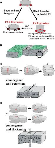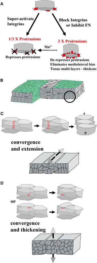 Figure 8. (A) Control of protrusive rates and orientation by FN/integrin interactions. Superactivation of integrins with Mn2+ results in reduced protrusive rates whereas removal of FN fibrils or inhibition of α5β1 enhances the frequency of protrusions and results in loss of mediolateral orientation.
