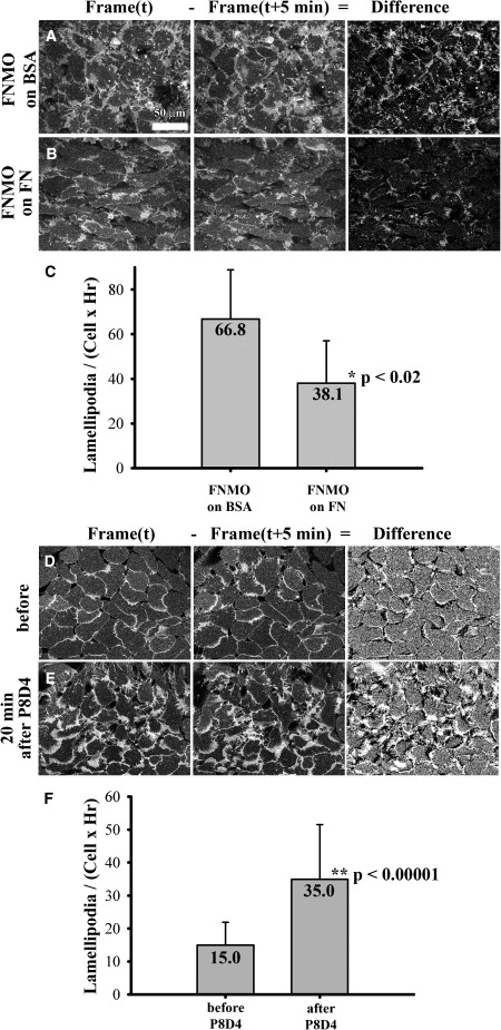 (A and B) Two frames from representative confocal time-lapse sequences of 15 μMoles FNMO-injected explants expressing GAP43-GFP and their calculated âdifferenceâ images were calculated for explants cultured on BSA ([A]; see Movie S3) and on fibronectin ([B]; see Movie S4). A âdifference time-lapseâ sequence shows regions of cell protrusion and retraction as solid white and black regions, respectively, while regions where little change occurs are typified by gray.