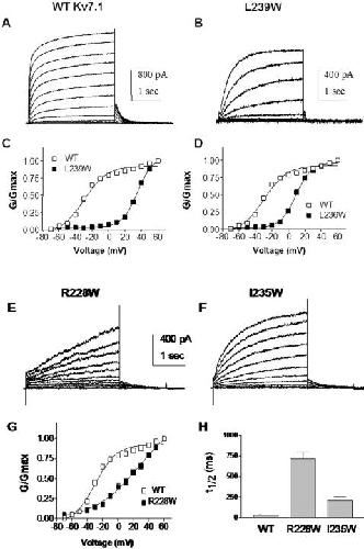 Figure 6. Effect of KCNE1 co-expression with mutant G229W.Representative current traces of WT IKS (A) and mutant G229W expressed without (B) or with KCNE1 (C). From a holding potential of −90 mV, the membrane was stepped for 3 s from −70 mV to +60 mV in 10 mV increments and then repolarized for 1.5 s to −60 mV to generate the tail currents. Conductance-voltage relations (D) and current-voltage relations (E) of WT Kv7.1 and mutant G229W co-expressed with KCNE1.