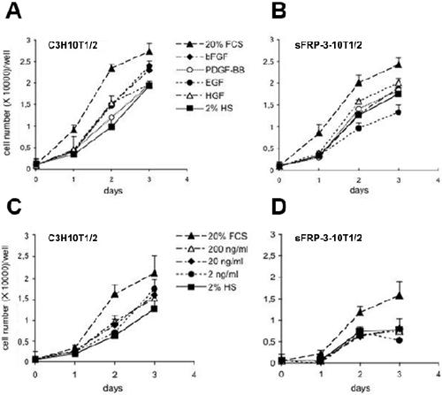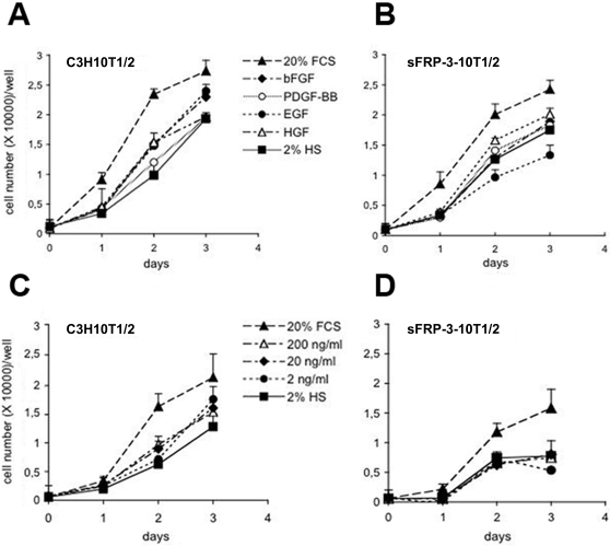 Figure 2. sFRP-3 inhibits proliferation induced by EGF.(A–D) Effect of growth factors on sFRP-3 expressing C3H10T1/2 cells. Growth curves of C3H10T1/2 cells (A) and sFRP-3 expressing C3H10T1/2 (B) cultivated in 2% horse serum (HS)±specific growth factors. Cells grown in 20% FCS or 2% HS alone represented positive and negative control respectively. At the time points indicated, cells were fixed and stained with 0.1% crystal violet solution as described in the Materials and Methods. Dose-dependent effect of EGF on control (C) and sFRP-3 expressing C3H10T1/2 cells (D).