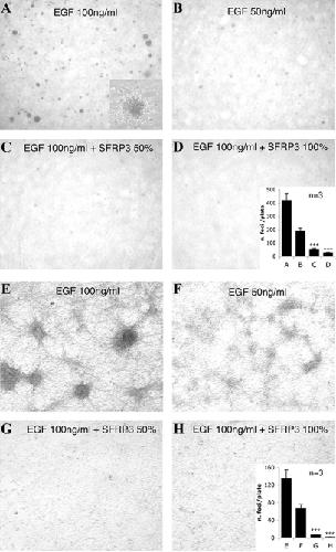 Figure 3. sFRP-3 inhibits proliferation EGF-dependent foci formation.(A–D) sFRP-3 inhibits the EGF-induced colony formation and focal transformation of EGF-receptor over-expressing NIH 3T3 cells. EGF-dependent cell growth in soft agar. NIH3T3 clone 17 cells suspended in agar containing normal medium and treated with either 100 ng/ml (A) or 50 ng/ml (B) of EGF formed clearly visible colonies. The effect of EGF was inhibited in cells suspended in agar containing a 1∶1 mixture of normal medium and sFRP-3-containing medium (CM) (C) or the sFRP-3-CM alone (D). Photographs were taken after 20 days of growth at 2× magnification. Insert in D shows a 20× magnification of one colony; insert in H shows the results obtained by counting the colonies in 3 independent, reproducible experiments±SE. Error bars represent s.e.m. Triple asterisks, P<0.001 vs EGF. (E–H) EGF-dependent focal transformation. NIH3T3 clone 17 cells cultured for 10 days in normal medium containing 100 ng/ml EGF (E) or 50 ng/ml EGF (F) formed foci. This focal transformation was inhibited incubating the cells in a 1∶1 mixture of normal medium and sFRP-3-CM (G) or the sFRP-3-CM alone (H). Photographs were taken after 10 days of growth at 10× magnification. Insert in H shows the results obtained by counting foci in 3 independent, reproducible experiments±SE. Error bars represent s.e.m. Triple asterisks, P<0.001 vs EGF.