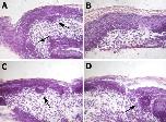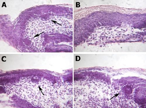Figure 5. sFPR-3 and EGF reciprocal antagonism on hair follicle development.(A–D) sFPR-3 antagonizes the EGF effect rescuing the hair follicle formation in an organ culture of developing mouse skin. Ectoderm explants growth for 48 hours in control medium (A) or in control medium supplied with 7 µg/ml sFRP-3-HA (C), showing normal hair follicles differentiation (black arrows). (B) Ectoderm explants growth in organ culture in medium supplied with 100 ng/ml recombinant EGF for 48 hours, lacking hair follicle differentiation. (D) The co-treatment with EGF and sFPR-3 rescue the hair follicle formation (black arrow).