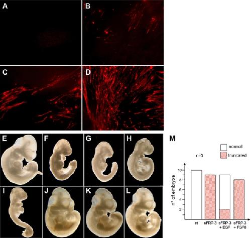 Figure 7. EGF reverts sFRP-3-induced inhibition of somitic myogenesis.(A–D) EGF reverts sFRP-3-induced inhibition of somitic myogenesis in explant cultures. MyHC antibody staining on explants cultures of presomitic mesoderm from E9.5 Myf5a2 embryos in the presence of sFRP-3 and EGF proteins. Mesoderm differentiation, which is almost completely abolished in the presence of sFRP-3 protein (A), is partially to fully restored when increasing amount of EGF are added to the culture (B–D: 50, 100 and 200 ng/ml), as revealed by the increasing number of positive MyHC fibers. (E–M) EGF rescues inhibition of myogenesis induced by sFRP-3 in vivo. (F,G) Transplacental delivery of s-FRP3 causes severe malformations of the caudal region of injected embryos. (J–L) Normal embryo morphology is restored when sFRP-3 is co-injected together with EGF, but not with FGF (H; I). (E) Control not-injected embryo. (M) Quantification of injected embryos with their relative phenotype in 3 independent, reproducible experiments.