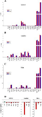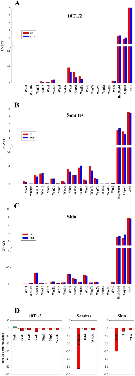 Figure 8. Wnts expression profile in C3H10T1/2 and embryonic explant cultures.Wnt genes expression in C3H10T1/2 fibroblast (panel A), somites (panel B) and embryonic skin (panel C). Histograms represent the relative expression level for each gene in control (red bars) and EGF-treated (blue bars) samples, as calculated with the 2ˆ (−Δ Ct) formula in comparison with the housekeeping genes Hsp90ab1, Gapdh and Actb (see Materials and Methods for details). (Panel D). EGF-modulated genes in C3H10T1/2 fibroblast, somites and embryonic skin. For genes description, see Table S2.