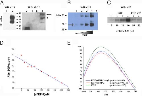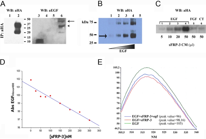 Figure 9. sFRP-3 binds EGF in vitro.(A) Co-IP of sFRP-3-HA and EGF. Supernatant from 293 cells transfected with control plasmid (lanes 1, 4) or purified sFRP-3-HA (lanes 2, 5, 6) were incubated with mouse recEGF (lanes 4, 6), DTSSP cross-linked and analysed under non-reducing conditions. Western blot analysis with anti-HA (lanes 1, 2) and anti-EGF antibodies (lanes 3–6) revealed the presence of EGF bound to sFRP-3-HA (lane 6), but not in the control sample (lane 4). Note that the shift in molecular weight of the band(s) corresponding to sFRP-HA (lane 2) is due to EGF binding (arrow and arrowhead in lane 6). Free mouse recEGF was used as positive control for the immunoblot (lane 3). (B) Dose-dependent binding of EGF to sFRP-3. In vitro binding of increasing amount of EGF (100 ng, 200 ng, 400 ng and 600 ng,) to sFRP-3-HA (100 ng), followed by DTSSP crosslinking and revealed by Western blot analysis with anti-HA. The amount of EGF/sFRP-3 complexes (lanes 1–4) correlates with the increasing amount of EGF. As control for binding specificity, 100 ng of sFRP-3-HA alone (lane 5, not detectable) were cross-linked and revealed as before. (C) In vitro binding of sFRP-3 to EGF-loaded heparin beads. Western blot analysis with anti-HA on proteins adsorbed on EGF-loaded (lanes 1–4), FGF8-loaded (lane 5) and control beads (lane 6), following incubation with increasing amount of sFRP-3-HA supernatant (5–50 µl). sFRP-3 binds specifically to EGF, in a dose dependent manner. (D) Binding affinity of EGF for sFRP-3. EGFAlexa488 fluorescent absorbance at emission peak (517 nm) decreases in relation of increasing amount of sFRP-3. (E) Competition assay. Absorbance scanning from emission value 505 nm to 540 nm of EGFAlexa488 (green curve). A decreasing of the emission peak (517 nm) is shown in relation to EGFAlexa488/sFRP-3 interaction (red curve). By adding native egf to EGFAlexa488 prior to the incubation with sFRP-3, the absorbance reduction of the emission peak was smaller (blue curve).