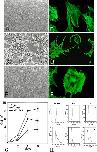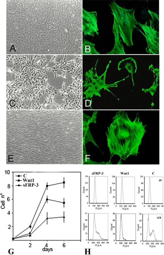 Figure 1. sFRP-3 modifies cytoskeleton and reduces proliferation of C3H10T1/2 fibroblast.Morphology of C3H10T1/2 cells infected with vectors expressing puro cDNA (A), sFRP-3 cDNA (C), Wnt-1 cDNA (E). When stained for F-actin with falloidin (see Materials and Methods) both control cells (B) and Wnt-1 expressing cells (F) showed well organize stress fibers, whereas sFRP-3 expressing cells (D) showed membrane ruffles, filopodia and disorganized actin fibers. (G) Growth curves for control, Wnt-1 and sFRP-3 expressing cells. Cells were plated at an initial density of 2×104 cells/60 mm dish in DMEM 5% FCS and re-fed on day 2 and 4. Cell numbers were measured by detaching cells with trypsin and counting triplicate samples for each point. (H) C3H10T1/2 cells stably transfected with sFRP-3, Wnt1 expression vector or empty vector as control (C), maintained in DMEM 10% FCS, were starved in DMEM serum free medium. After 24 serum was added again to the medium and cells analyzed for their DNA content by flow cytometry after Propidium Iodide, staining after 0, 18 and 20 h. Representative plots are shown in the upper panel for the three cell lines at t0 (upper plots) and t18 (lower plots).