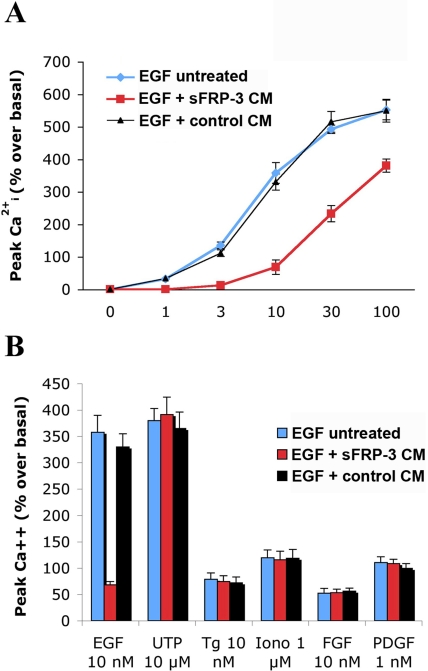 Figure 4. sFRP-3 inhibits the EGF-induced [Ca2+]i variations in EGFR-T17 cells.Fura-2 loaded cells, suspended in KRH medium, were incubated with medium conditioned (CM) either by sFRP-3-expressing or not expressing cells, and challenged with increasing concentrations of EGF (A), or submaximal concentrations of FGF (10 nM), PDGF (1 nM), UTP (10 µM), thapsigargin (Tg, 10 nM) or iomomycin (Iono, 1 µM) as indicated (B). Shown are the [Ca2+]i changes±s.e.m. measured as % increases over resting [Ca2+]i values (n = 4). These were 136±12 nM and were not changed by the addition of sFRP-3 CM or control CM.