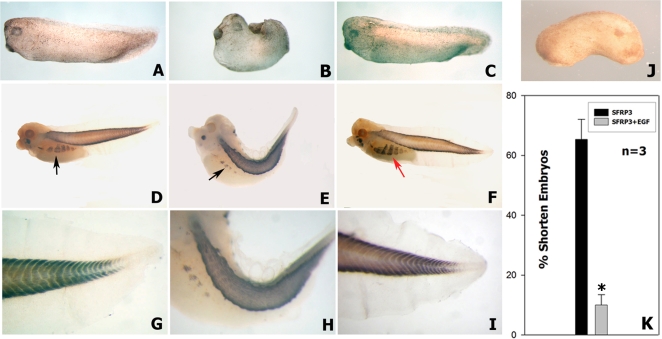 Figure 6. EGF specifically antagonizes sFPR-3 effects in Xenopus embryos.(A) Lateral view of a normal embryo at stage 28/29 NF un-injected. (B) Embryo injected with 4 ng of mouse sFPR-3 mRNA at stage 28/29 NF, showing a remarkable shortened of the trunk and the tail and a reduced muscle differentiation. (C) Rescue of the shortened phenotype by co-injection of 4 ng of sFPR-3 and 8 ng of EGF mouse mRNAs. (DâI) Whole mount immunostaining with 12â101 specific amphibians muscle monoclonal antibody, peroxidase detected. (D) Normal embryo un-injected at stage 35/36 NF, showing black labeling in the trunk and tail muscles and in the parietal muscle (black arrow). (E) Injected embryo with mouse sFPR-3 mRNA at stage 35/36, presenting a shortened trunk and a kinky tail; furthermore the parietal muscles (black arrow) are remarkably reduced. (F) Rescue of the shortened kinky phenotype, showing completely restored muscle differentiation also in the parietal muscle (red arrow). (GâI) High power magnification respectively of DâF, showing in detail the chevron like organization of the tail muscles of un-injected normal larvae (G), missing in the sFRP-3 treated tadpoletail (H) and restored in the co-injected larvae with EGF mouse mRNA (I). (J) Lateral view of a co-injected embryo with 4 ng of sFRP-3 and 8 ng of FGF-8 mouse coding mRNAs, showing no rescue of the sFRP-3 phenotype. (K) Quantization of multiple injections (nâ=â3) showing the rate of the phenotype rescue by co-injection with 8 ng of EGF mouse mRNA after the injection of sFPR-3 (asterisk indicates statistical significance P<0.001).