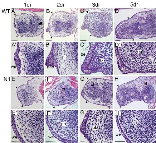 Figure 1. Histological characterisation of hindlimb bud regeneration in WT and N1 tadpoles Histological characterisation of hindlimb bud regeneration in WT and N1 tadpoles. Representative haematoxylin and eosin stained 5 μm sections showing the phenotypic differences between regenerating WT and non-regenerating transgenic N1 hindlimb buds. Stage 52 limb buds were amputated at knee level and heat shocked as previously. Cartilage condensa- tions are marked with a c. (A-D) WT limb buds, scale bars are 100 μm. Black arrowheads show the approximate plane of amputation. (A'-D') Higher magnification focusing on the distal area, scale bars are 50 μm. (A, A') wound healing has occurred after 24 hours and a wound epithelium (we) covers the cut site. (B, B') 2 days after amputation, blastema (bl) and AEC (aec) are forming. (C, C') 3 days after amputation, a cone-shaped blastema and the AEC are well established. Columnar basal epithelial cells (be) can be seen. Hypertrophic epithelial cells (h) can be seen in the AEC. (D, D') 5 days after amputation, the AEC and blastema are still apparent and outgrowth has begun. Muscle cells (m) can be seen proximally. (E-F) N1 limb buds, scale bars are 100 μm. Connective tissue (ct) is more obvious in these limb buds. E'-F' Higher magnification focusing on the distal area, scale bars are 50 μm. (E, E') wound healing has occurred after 24 hours, and a wound epithelium (we) covers the cut surface. (F, F') No AEC is apparent after 2 days and a rounded pseudoblastema (pb) forms proximal to the wound epithelium. (G, G') 3 days after amputation. (H, H') 5 days after amputation, the pseudoblastema has not expanded and a cell-free area of matrix is visible between the wound epithelium and underlying stump cells. Distal is to the left and posterior uppermost. dr = days of regeneration.
