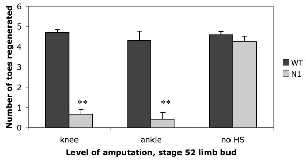 Figure 3. Effect of Noggin over-expression on regeneration outcome following amputation at the future knee or ankle level. Histogram of limb regeneration success as defined by the number of toes regenerated by stage 58 following amputation at either the future knee or ankle level of the limb bud at stage 52. WT and N1 animals were both subjected to heat shocks that activate transgene expression of Noggin in N1s. Non heat shocked controls were amputated at knee level. Error bars represent standard error and significant differences between WT and N1 animals are denoted by **).