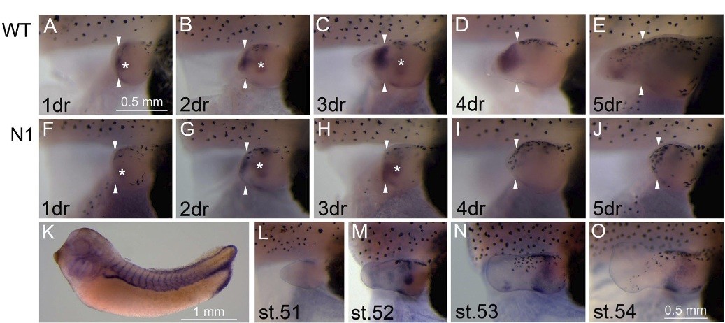 Figure 4. Expression of Gremlin in regenerating WT and N1 limbs and during development Expression of Gremlin in regenerating WT and N1 limbs and during development. Gene expression in regenerating wild type (WT) and N1 limbs and embryotissue. (A-J) In situ hybridisation showing Gremlin expression in the regeneration bud. (L-O) Unoperated limb buds illustrating Gremlin expression during limb development. (K) In situ hybridisation showing Gremlin expression in a stage 32 embryo, the expression pattern is consistent with previously published Gremlinembryo expression [30]. White arrowheads indicate approximate amputation plane, scale bar in A applies to panels A-J and scale bar in O to pan- els L-O. In limb panels (A-J, L-O) posterior is uppermost, and distal to the left, dr = days of regeneration. In K, anterior is to the left and dorsal uppermost. White asterisks mark areas of Gremlin expression that are developmental and unrelated to regeneration.