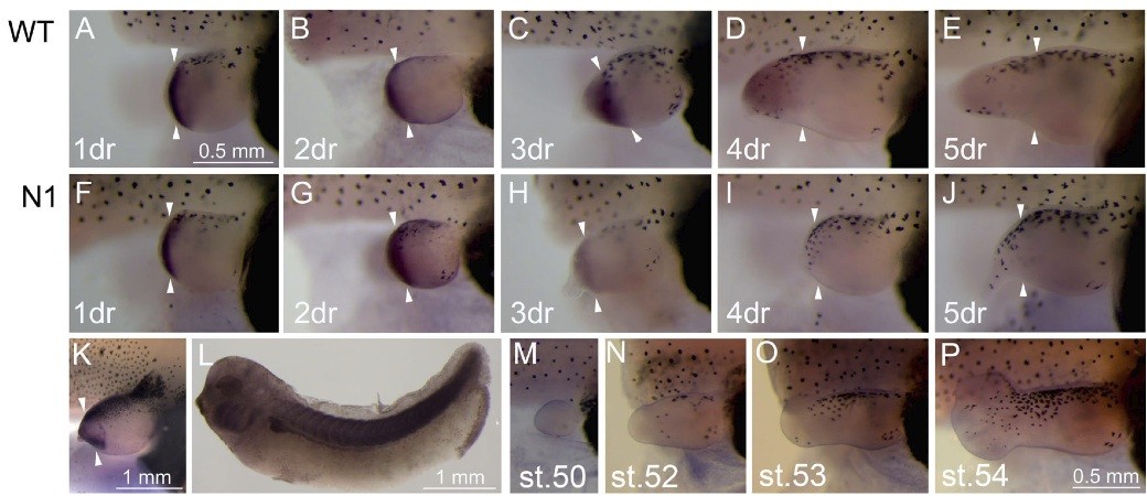 Figure 5. Expression of HSP60 in regenerating WT and N1 limbs and during development Expression of HSP60 in regenerating WT and N1 limbs and during development. Gene expression in regenerating WT and N1 limbs and embryotissue. (A-J) In situ hybridisation showing Hsp60 expression in the regeneration bud. (M-P) Unoperated limb buds illustrating Hsp60 expression during limb development. (K) In situ hybridisation showing Hsp60 expression in stage 57 hindlimb of a WT animal 2 days after amputation. (L) In situ hybridisation showing Hsp60 expression in stage 32 embryo. White arrowheads indicate approximate amputation plane, scale bar in A applies to panels A-J and scale bar in P applies to panels M-P. In limb pictures (A-K, M-P) posterior is uppermost, and distal to the left, dr = days of regeneration. In L, anterior is to the left and dorsal uppermost.