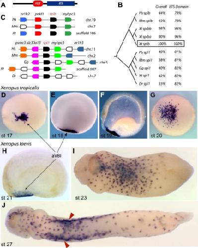 Figure 1. Xenopus spib identification. (A) Conserved protein motifs in spib and spi1; the PEST degradation domain and ETS DNA-binding domain. (B) ClustalW tree alignment on vertebrate spib and spi1 protein sequences and percentage identity over their entirety and DNA-binding domains. (C) Genome organization around the known vertebrate spib and spi1 genes, showing synteny between various vertebrate genomes. Genes shown in the same color represent putative orthologous genes. Expression pattern of Xenopus tropicalis spib and (D-G) Xenopus laevis spib paralogs (SpiBa and SpiBb, H-J) is indistinguishable and marks a population of primitive myeloid progenitors in the anterior ventral blood islands (aVBIs). spib expression is transient and first detected at stage 17. (F) Cleared embryo shows only mesodermal expression, and (J) spib expression is eventually down-regulated after spib-expressing cells associate with vitelline veins (arrowheads). Anterior is to the left, and dorsal to the top in all lateral views; panels D, G, and I,J represent ventral views. The following database sequences were used: Hs spib Q01892, Mm spib O35906, Xl spiba BC046671, Xl spibb BC130210, Xt spib IMAGE 7023083, Hs spi1 P17947, Mm spi1 P17433, Gg spi1 NP_990354, Xt spi1 BC098077, and Dr spi1 CAD58735 (outgroup NP_001008139 and P14921).