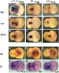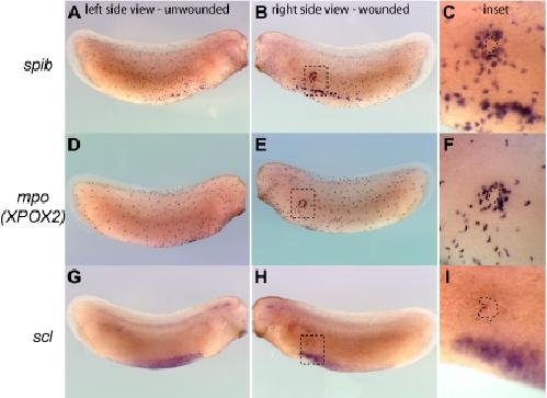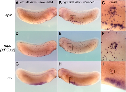Figure 3. Recruitment of primitive myeloid cells to embryonic wound sites in Xenopus laevis. spib (A-C), mpo (XPOX2) (D,E), and scl (G-I) whole mount in situ hybridization in wounded embryos. Three hours is sufficient for the recruitment of myeloid cells expressing spib or mpo to the scrape wound outline (dashed line contour in the inset). scl-expressing cells are not recruited to the wound site, and primitive myeloid cell recruitment occurs before the appearance of a fully functional vascular network.