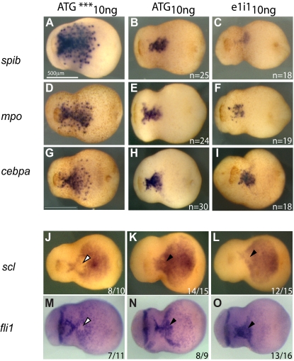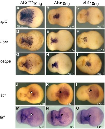 Figure 7. Analysis of migratory potential and hemangioblast-like characteristics of primitive myeloid progenitors in spib-depleted embryos. Migration away from the aVBI is the first morphologic sign of primitive myeloid differentiation and is absent in spib-depleted embryos. (A-I) In spib-depleted embryos, we never observed isolated cells far from the aVBI expressing spib, mpo, and cebpa at a time when migration should have already set in. Usual down-regulation of scl and fli (â¿, J,M) is eliminated in spib morphants (â¼, K,L and N,O). The scl+fli+ hemangioblast-like characteristics are maintained for longer in a small subset of spib-depleted aVBI tissue.