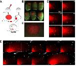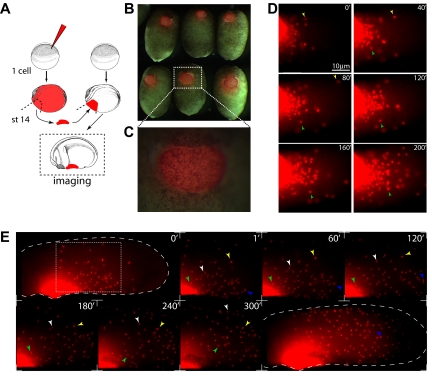 Figure 2. Primitive myeloid migration time-lapse video microscopy. (A) Experimental setup, stage-14 to -16 anterior ventral blood islands were transplanted from microruby-injected to noninjected embryos. Transplanted cells become migratory and leave the transplant to colonize the embryo in 4 to 8 hours. Throughout this period, primitive myeloid cells show different behaviors (Videos S1âS3). (B,C) Stage-18 brightfield/fluorescent composite of transplanted embryos. (D,E) Stills from supplementary movies. (Panel D and Video S2) Ventral view of primitive myeloid cells leaving the transplanted aVBI with âblebbingâ behavior and low migratory speeds. (Panel E and Video S3) Primitive myeloid cells leaving the transplanted aVBI (stage 26, lateral view). At this stage, cells acquire elongated cell morphology and higher motility. Large dashed line shows the embryo contour, and the light dashed square shows the enlarged region shown in still frames. Colored arrowheads point and track the same cell. (D,E) Anterior view is shown to the left; dorsal, to the top. Time is shown in minutes. Images in panels B and C were obtained on a fluorescence stereoscope Leica MZ FLIII (Wetzlar, Germany) attached to a Sony CCD camera DXC-950 image capture system controlled by Northern Eclipse software 7.0 (Empix Imaging, Mississauga, ON). For panels D and E, the same image capture system was attached to an Olympus IX70 inverted fluorescent microscope; 0.1Ã MMR was used as imaging medium. (D) Total magnification 300Ã objective (Olympus LCPlan 20Ã/0.4 NA). (E) Total magnification 40Ã objective (Olympus UPlanFL 4Ã/0.13 NA). Photoshop CS2 (Adobe Systems, San Jose, CA) or ImageJ 1.38 (National Institutes of Health, Bethesda, MD) were used for image or time-lapse video processing.