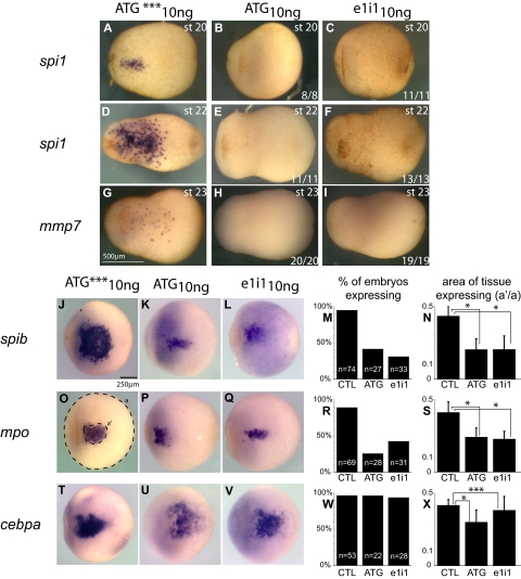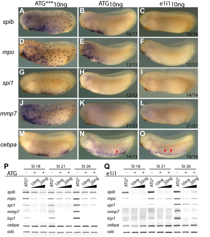 Figure 5. spib is necessary for primitive myeloid differentiation. spib-depleted embryos show absence or reduced expression of mpo, spi1, and mmp7 but not cebpa. (A-O) WMISH and (P,Q) RT-PCR analysis on spib ATG and e1i1 morphants. ATG*** is a 3-mismatch ATG morpholino. (P) spib ATG morpholino reduces but does not eliminate all spib transcripts, (Q) whereas spib e1i1 morpholino eliminates functional spib mRNA at 10 ng. (A-F) Severe reduction on the number of spib- and mpo-expressing cells and (J-O) marked absence of spi1 and mmp7 expression on spib morphants. (G-I) Under the same experimental conditions, cebpa-expressing cells are not affected. All embryos are shown in lateral views with anterior to the left. The number of representative embryos is shown at the bottom right corner of each panel.