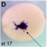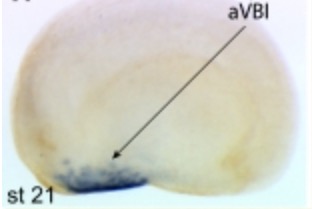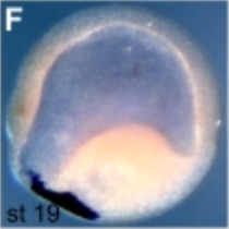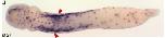 sbi1 (Spi-1 proto-oncogene) gene expression in Xenopus tropicalis embryo, assayed via in situ hybridization, NF stage 20 ( left) and NF stage 23 (right), ventral view, anterior left.