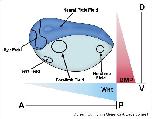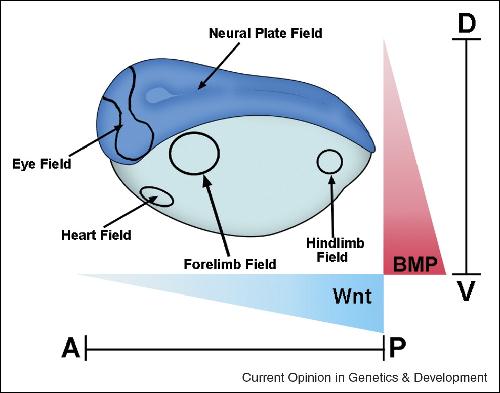 Figure 1. Xenopus gastrula stage embryo showing some of the main morphogenetic fields that form along the D–V (BMP) and A–P (Wnt) axes. These fields are considered self-regulating (as is the early blastulaembryo as well) because they can be cut in half and regenerate the whole pattern after transplantation [1]. BMP signals are high in the ventral side and decrease dorsally, while Wnt signals are strong in the posterior and weaken anteriorly. Cells at different positions within these two Cartesian axes read these morphogen gradients and determine the embryonic body plan that specifies the place at which the various organs will be subsequently formed.