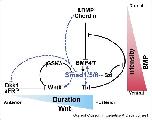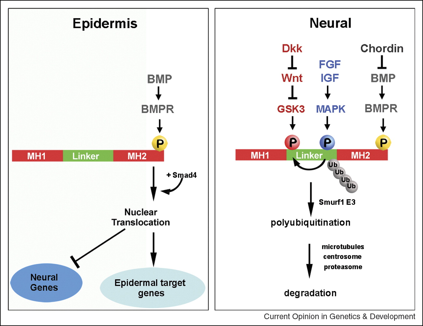 Figure 3. Phosphorylations of the transcription factor Smad1 determine the type of cell differentiation; BMP provides the intensity of the pSmad1Cter and Wnt prolongs its duration. The double phosphorylation of Smad1 by MAPK and GSK3 is required for its ubiquitination and termination of the pSmad1Cter signal through degradation of the activated transcription factor in the proteasome [28••]. MH1 and MH2 refer to the conserved Mad homology domains present in Smad transcription factors.