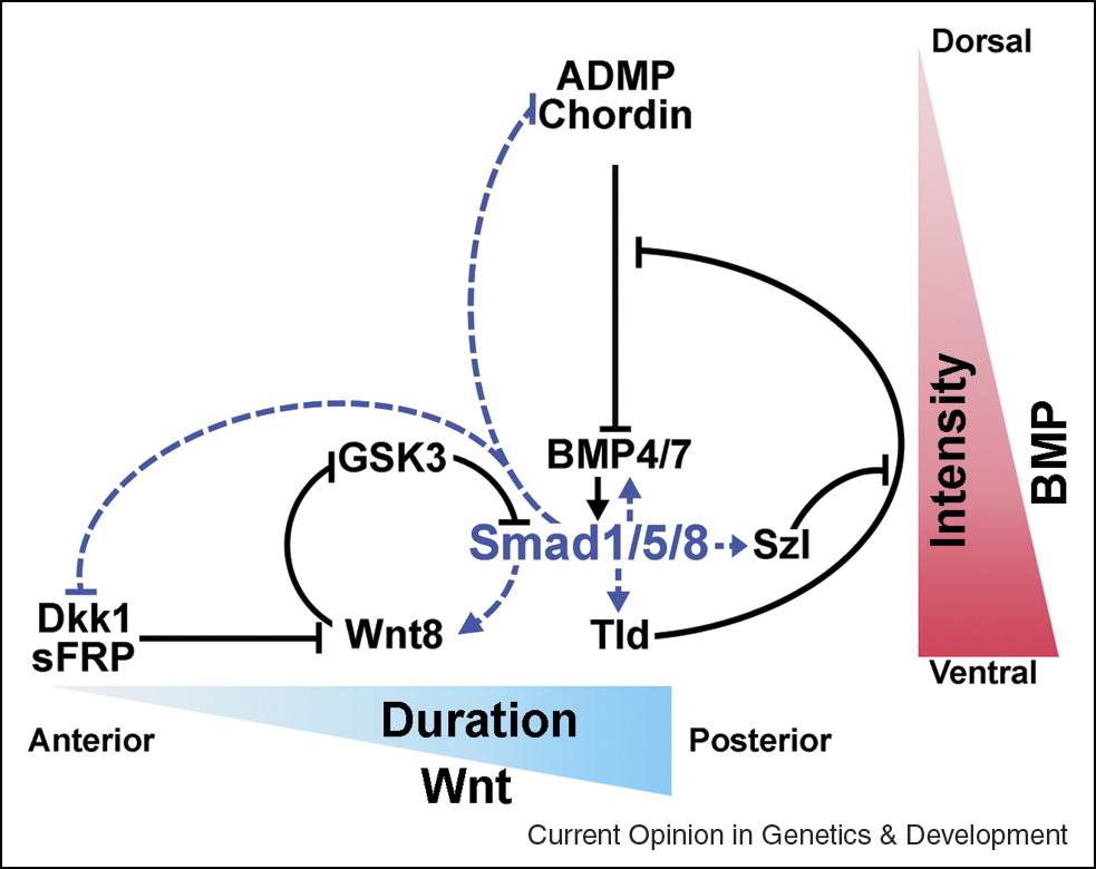 Figure 4. Model of the integration of the BMP (D–V) and Wnt (A–P) patterning pathways at the level of Smad1/5/8 linker phosphorylations. Blue dotted arrows indicate transcriptional regulation by Smad1/5/8 and black arrows indicate direct protein–protein interactions. All these interactions have been confirmed in Xenopus embryos using loss-of-function and overexpression experiments [9, 10, 28••]. Not shown here are two BMP inhibitors produced in the ventral side called Crossveinless-2 and Bambi, which serve to dampen the BMP signal [9].