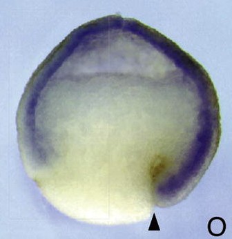 usf2 (upstream transcription factor 2 [provisional]) gene expression in Xenopus laevis embryo via in situ hybridization, NF stage10.5, lateral view, dorsal up, anterior left.