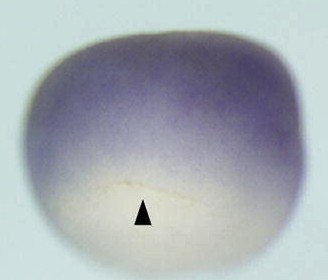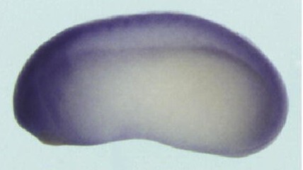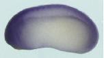 usf1 (upstream transcription factor 1 [provisional]) gene expression in Xenopus laevis embryo via in situ hybridization, NF stage 9, lateral view, dorsal up.
