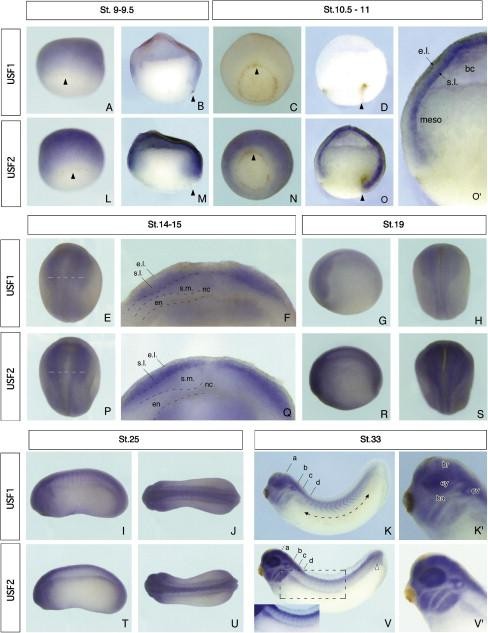 Fig. 3. Expression profiles of Xenopus laevis USF genes during embryonic development. WMISH analysis with digoxigenin-labeled probes was performed to determine the spatial expression patterns of USF genes during development. Stained embryos are shown at six stages as labeled in the figure. In the images of late blastula- (stages 9â9.5) and gastrula-stage (stages 10.5â11) embryos, arrowheads indicate the dorsal lip positions (blastula, initial dorsal lip pigment; gastrula, fine dorsal lip). A higher-magnification view of the gray rectangular region in panel O is shown in panel Oâ² [black dashed line: mesoderm (meso), white dashed line: border of epithelial layer (e.l.) and sensorial layer (s.l.); bc: blastocoel]. White dashed lines in panels E and P indicate the positions of the cuts made to give the cross-sections in panels F and Q. Panels F and Q are WMISH images of cut embryos at stages 14â15 (nc, notochord; e.l., epithelial layer of neuroectoderm; s.l., sensorial layer of neuroectoderm; s.m., somitic mesoderm; en, endoderm). The borders of the three germ layers are indicated at the left side of the embryo as dashed lines. Different views of stage 19 and 25 embryos are shown (H, J, S and U dorsal; G, I, R and T, lateral). Panels K and V are lateral views of late tailbud-stage embryos (stage 33). The dashed line with arrowheads indicates the somite stained with the USF1 probe (panel K). Arrowhead (white) indicates the lateral plate mesoderm stained with the USF2 probe (panel V). Small lines (aâd) in panels K and V point to where the transverse sections of the stage 33 WMISH sample (Fig. 5) were taken. Panels Kâ² and Vâ² are higher-magnification views of the gray boxes in panels K and V (br, brain; ov, otic vesicle; ey, eye; ba, branchial arches). Inset in V is a highly contrasted view of the area indicated by dashed box in panel V (pronephros).
