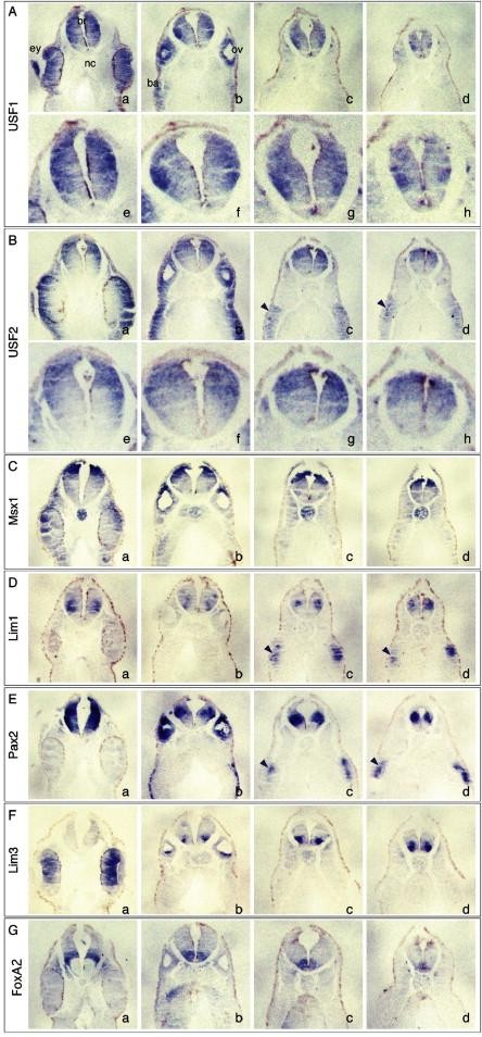 Fig. 5. Expression of Xenopus laevis USF genes in the CNS at the tailbud stage. Sections of embryos stained by WMISH are shown. A and B are images from embryos stained by USF probes (A, USF1; B, USF2). The positions of sections aâd in the embryos are indicated in Fig. 3K and V. Higher-magnification views of the neural tube in panels aâd are shown in panels eâh. CâG are the corresponding sections [from the embryos stained by WMISH with CNS specification markers from dorsal to ventral: C, Msx1 as marker of roof plate ([Liem et al., 1995] and [Schlosser and Ahrens, 2004]); D, Lim1 as alar plate (Taira et al., 1994); E, Pax2 as lateral part of CNS ([Mansouri et al., 1996] and [Heller and Brandli, 1999]); F, Lim3 as basal plate (Taira et al., 1993); G, FoxA2 as floor plate (Lee et al., 1997)]. Arrowheads indicate the pronephros. br, brain; nc, notochord; ov, otic vesicle; ey, eye; ba, branchial arches.