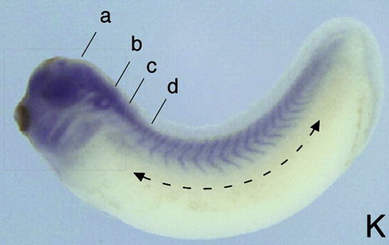 usf2 (upstream transcription factor 2 [provisional]) gene expression in Xenopus laevis embryo via in situ hybridization, NF stage 25, lateral view, dorsal up, anterior left.