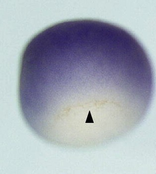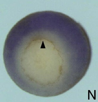 usf2 (upstream transcription factor 2 [provisional]) gene expression in Xenopus laevis embryo via in situ hybridization, NF stage 9, vegetal view, dorsal up.