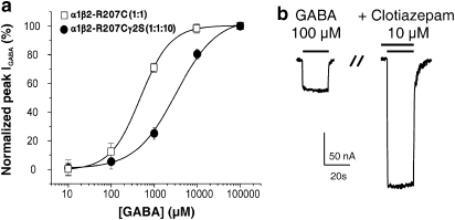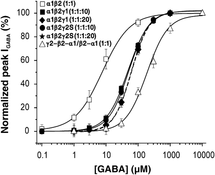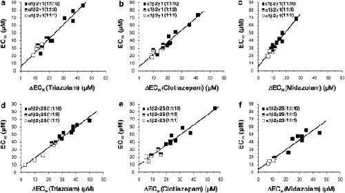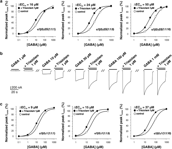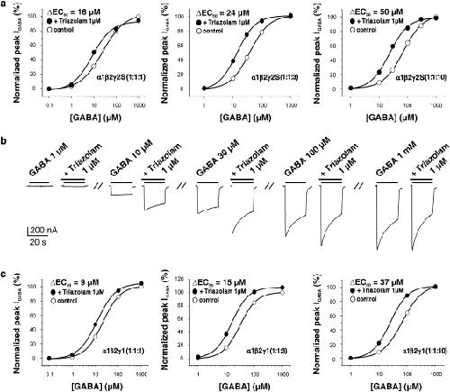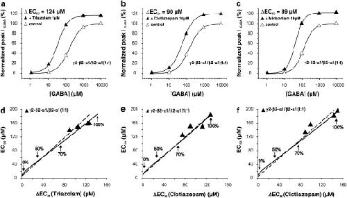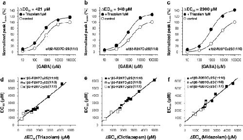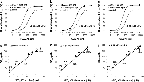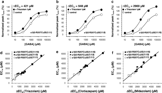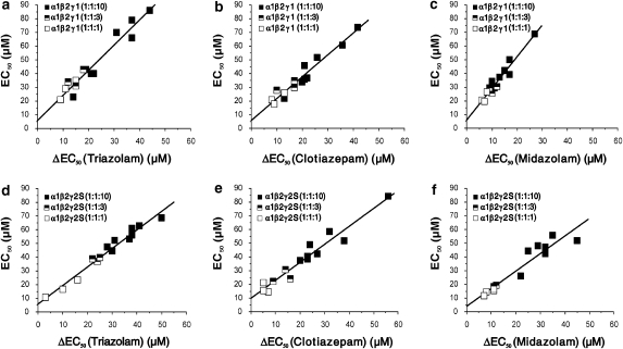 Heterologous expression of alpha1, beta2 and gamma2S(gamma1) subunits produces a mixed population of GABA(A) receptors containing alpha1beta2 or alpha1beta2gamma2S(gamma1) subunits. GABA sensitivity (lower in receptors containing gamma1 or gamma2S subunits) and the potentiation of GABA-activated chloride currents (I(GABA)) by benzodiazepines (BZDs) are dependent on gamma2S(gamma1) incorporation. A variable gamma subunit incorporation may affect the estimation of I(GABA) potentiation by BZDs. We propose an approach for estimation of BZD efficiency that accounts for mixed population of alpha1beta2 and alpha1beta2gamma2S(gamma1) receptors.We investigated the relation between GABA sensitivity (EC50) and BZD modulation by analysing triazolam-, clotiazepam- and midazolam-induced potentiation of I(GABA) in Xenopus oocytes under two-microelectrode voltage clamp.Plotting EC50 versus BZD-induced shifts of GABA concentration-response curves (DeltaEC50(BZD)) of oocytes injected with different amounts of alpha1, beta2 and gamma2S(gamma1) cRNA (1:1:1-1:1:10) revealed a linear regression between gamma2S(gamma1)-mediated reduction of GABA sensitivity (EC50) and DeltaEC50(BZD). The slope factors of the regression were always higher for oocytes expressing alpha1beta2gamma1 subunit receptors (1.8 +/- 0.1 (triazolam), 1.6 +/- 0.1 (clotiazepam), 2.3 +/- 0.2 (midazolam)) than for oocytes expressing alpha1beta2gamma2S receptors (1.4 +/- 0.1 (triazolam), 1.4 +/- 0.1 (clotiazepam), 1.3 +/- 0.1 (midazolam)). Mutant GABA(A) receptors (alpha1beta2-R207Cgamma2S) with lower GABA sensitivity showed higher drug efficiencies (slope factors=1.1 +/- 0.1 (triazolam), 1.1 +/- 0.1 (clotiazepam), 1.2 +/- 0.1 (midazolam)).Regression analysis enabled the estimation of BZD efficiency when variable mixtures of alpha1beta2 and alpha1beta2gamma2S(gamma1) receptors are expressed and provided new insights into the gamma2S(gamma1) dependency of BZD action.