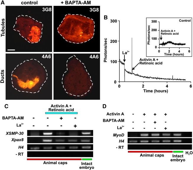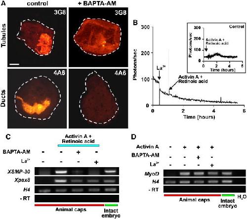 Fig. 2. Effect of blocking the Ca2+ increase on tubule differentiation. (A) The animal caps removed at stages 8â9 were incubated in the presence (right panels) or absence (left panels) of 20 µM BAPTA-AM for 30 min prior to incubation with activin A (10 ng/mL) and retinoic acid (10â 4 M) for 3 h. Animal caps were then cultured until stage 39, fixed and immunolabeled with the tubule-specific monoclonal antibody, 3G8 (upper panels) or with the duct-specific monoclonal antibody, 4A6 (lower panels). Scale bar is 100 µm. (B) A representative example of a PMT trace obtained from an aequorin-loaded animal cap pre-incubated in 50 µM La3+ prior to the addition of activin A and retinoic acid. Light emission, expressed in photons per second and reflecting changes in [Ca2+]i, is inhibited in the presence of La3+. Inset, increase in light emission upon addition of activin A and retinoic acid on a sibling control animal cap. (C) The expression of the early pronephros marker XPax8, and of the pronephric tubule marker XSMP-30 in 10 animal caps measured by RT-PCR. Animal caps were pre-incubated (+) or not (â) for 30 min in 20 µM BAPTA-AM or 50 µM La3+ prior to incubation with activin A and retinoic acid. (D) Expression of XMyoD, a marker for somitic mesoderm, in animal caps measured by RT-PCR. RNA from one sibling embryo at stage 35 served as positive control and PCR on RNA without reverse transcription was done to check the absence of genomic DNA (âRT). H4 was used as a loading control.