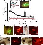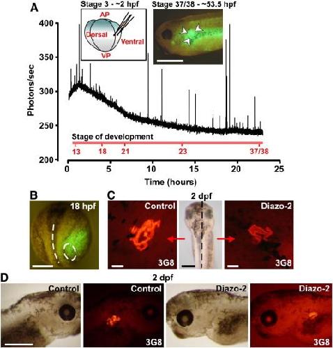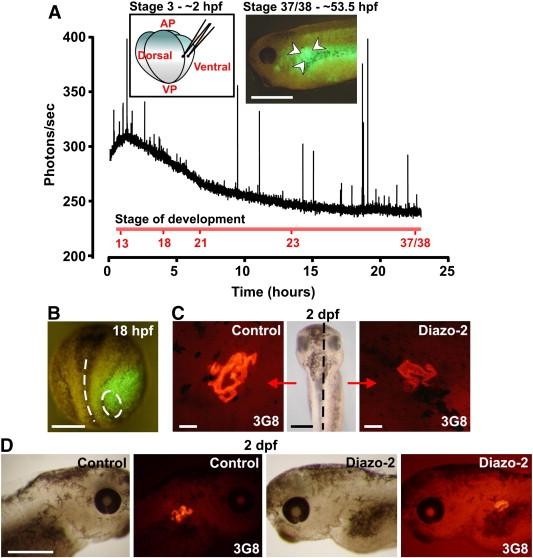 Fig. 4. Ca2+ is necessary for tubulogenesis in intact embryos. (A) f-aequorin was co-injected with EGFP mRNA (as lineage tracer), into the lateral marginal zone of one ventral and one dorsal blastomere of stage 3 embryos (upper left panel). Embryos were screened at late gastrula/early neurula stage and those exhibiting expression of EGFP in the presumptive pronephric territory were selected for subsequent examination via the PMT. These embryos were screened again at the end of the recording period to confirm EGFP expression in the pronephric tubules (upper right panel, white arrowheads). Anterior is to the left. Scale bar is 1 mm. A representative PMT trace indicating an increase in light emission, expressed in photons per second (integration time 30 s) and reflecting an increase in [Ca2+]i, was recorded during the development of an embryo from late gastrula (stage 13) up to stages 37/38 when the tubules are fully differentiated (n = 7). The main developmental stages, indicated on the red bar below the trace, are as follows: stage 13, late gastrula; stage 18, neural groove stage; stage 21, neural tube completely closed and first indication of pronephric anlagen; stage 23, 24-h old larva; stages 37/38, entire pronephros functional, 32-h old larva. (B) The inactive caged Ca2+ chelator diazo-2 was co-injected with EGFP mRNA as in (A) and photo-activation of diazo-2 was performed at stages 16â17 (18 hpf). Dorsal view, anterior is on top. Scale bar is 0.5 mm. (C) The effect of diazo-2 uncaging on pronephric tubule formation was recorded when the larvae reached stages 37/38 (middle panel). Larvae were fixed and whole-mount immunolabeled with the 3G8 monoclonal antibody to label the pronephric tubules. Scale bar is 0.5 mm. In this example, the left side of the larva displays normal differentiated tubules (left panel) while the tubules on the diazo-2-injected/photoactivated side are shorter and wider (right panel). Scale bar is 100 µm for left and right panels. (D) Example of an uncaging experiment (n = 6) performed at gastrulation stage (stage 12.5). The uninjected (control) side of the larva (left pair of panels) displays normal development, as shown by the correct morphology of the head and eye (bright-field image) and a normal pronephric tubule (3G8 antibody fluorescent image). However, the diazo-2-injected/photoactivated side of the same larva (right pair of panels) shows that while the overall morphology of the larva is normal; see the morphology of the head and eyes (bright-field image), the morphology of the tubule is significantly altered (3G8 antibody fluorescent image). Scale bar is 0.5 mm.
