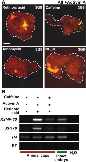 Fig. 3. Ca2+ is sufficient to trigger tubulogenesis following activin A treatment in animal caps. (A) Animal caps, excised at stages 8â9, were incubated for 3 h with activin A (10 ng/mL) and then for an additional 3 h with either retinoic acid (10â 4 M; upper left panel), caffeine (10 mM; upper right panel), ionomycin (1 µM; lower left panel), or NH4Cl (10 mM; lower right panel). The animal caps were then cultured until stage 41, fixed and immunolabeled with the tubule-specific monoclonal antibody, 3G8. Scale bar is 100 µm. (B) RT-PCR analysis of the expression of the early pronephros marker XPax8, and of the pronephric tubule marker XSMP-30. Animal caps were untreated (â) or treated for 3 h (+) with activin A (10 ng/mL) and then for an additional 3 h with either retinoic acid (10â 4 M) or caffeine (10 mM). RNA from one sibling embryo at stage 35 served as positive control and PCR on RNA without reverse transcription was done to check the absence of genomic DNA (âRT). H4 was used as a loading control.