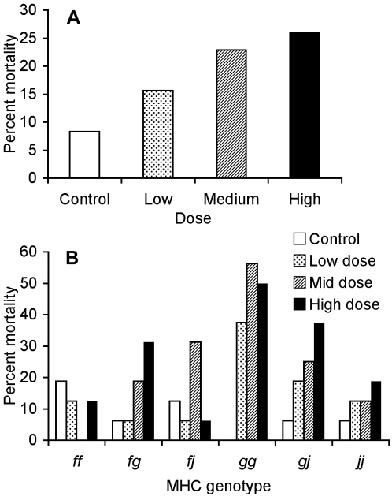 Figure 1. Mortality as a function of bacterial dose and MHC genotype among families.(A) Percent mortality of tadpoles exposed to the control (3.0×106 cfu/ml heat-killed), low (1.0×106 cfu/ml), medium (2.5×106 cfu/ml), and high (3.0×106 cfu/ml) doses of A. hydrophila. N = 90 in each treatment. (B) Percent mortality of tadpoles from each MHC genotype that were exposed to each dose of live A. hydrophila or the control. N = 15 in each condition.