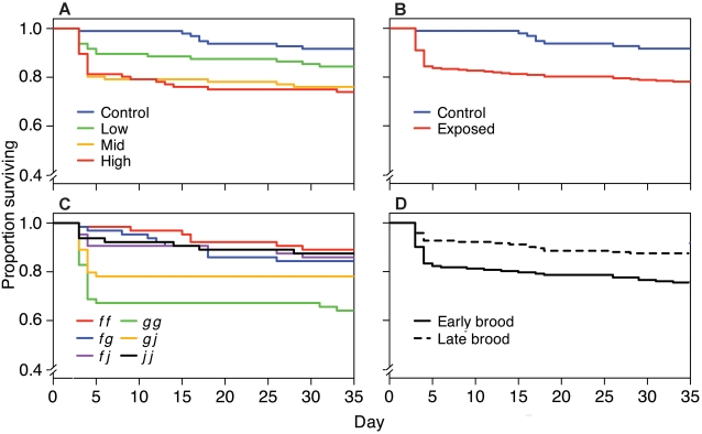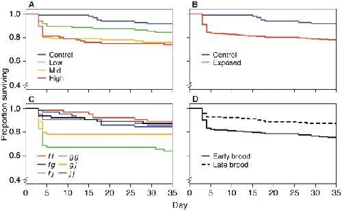 Figure 2. Survival with time as a function of bacterial dose, MHC genotype, and clutch order among families.Kaplan-Meier plots showing the survival of (A) tadpoles exposed to the control (3.0×106 cfu/ml heat-killed), low (1.0×106 cfu/ml), medium (2.5×106 cfu/ml), and high (3.0×106 cfu/ml) doses of A. hydrophila; (B) tadpoles exposed to the control or A. hydrophila (all doses combined); (C) tadpoles from each MHC genotype; and (D) tadpoles from early and late clutches.