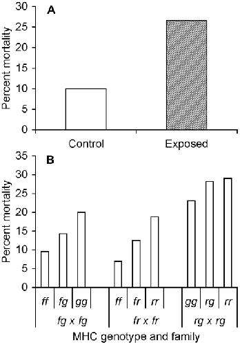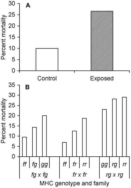 Figure 4. Mortality as a function of bacterial exposure and MHC genotype within families.(A) Percent mortality of tadpoles exposed to live (exposed) and heat-killed (control) A. hydrophila. N = 120 for each treatment. (B) Percent mortality of tadpoles with each MHC genotype from 3 different families. Sample sizes differed among families; see Table 1.