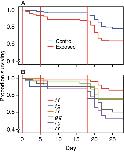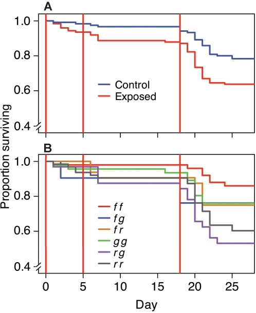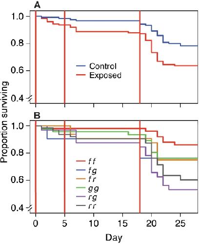 Figure 5. Survival with time as a function of bacterial exposure and MHC genotype within families.Kaplan-Meier plots showing the survival of (A) tadpoles exposed to live (exposed) or heat-killed (control) A. hydrophila, and (B) tadpoles with different MHC genotypes. Vertical lines indicate exposure days.
