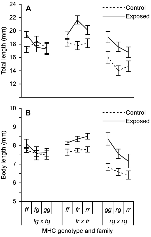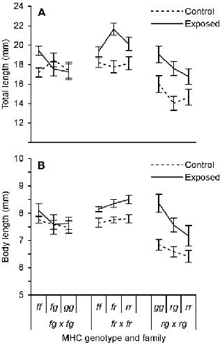 Figure 7. Growth as a function of MHC genotype within families.(A) Total and (B) body length (X̅±SE) of tadpoles on day 18 with different MHC genotypes that were either exposed to live or heat-killed A. hydrophila as a control.