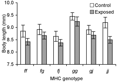 Figure 3. Growth as a function of MHC genotype among families.Body length (X̅±SE) at day 25 of tadpoles from each genotype exposed to the pathogen A. hydrophila and the control.