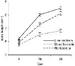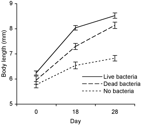 Figure 6. Growth as a function of bacterial exposure.Body length (X̅±SE) of tadpoles exposed to live A. hydrophila, heat-killed bacteria and no bacteria (controls) over time.