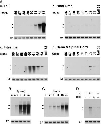 Fig. 2. Expression of the Xl MMP-9TH gene is induced during spontaneous metamorphosis and in a T3-treated XLT-15 cultured cell line. (A) The developmental expression of Xl MMP-9TH mRNA in tail, hindlimb, intestine and central nervous system. A Xl MMP-9TH probe was hybridized to 5 µg of total cellular RNA isolated from tail (a), hindlimb (b), intestine (c) and central nervous system (d) of stage 56â63 tadpoles. These blotting filters contain RNA of stage 58 tail for the comparison. Arrowheads indicate the positions of 18S and 28S rRNA. (B) The T3 doseâresponse of Xl MMP-9TH mRNA upregulation. A Xl MMP-9TH probe was hybridized to 5 µg of total cellular RNA isolated from XLT-15 cells treated with the indicated concentration of T3 for 24 h. (C) The time course of Xl MMP-9TH mRNA upregulation by T3. A Xl MMP-9TH probe was hybridized to 5 µg of total cellular RNA isolated from XLT-15 cells treated with 10 nm T3 for the indicated times. (D) The effect of protein synthesis inhibition on Xl MMP-9TH mRNA upregulation by T3. A Xl MMP-9TH probe was hybridized to 5 µg of total cellular RNA isolated from XLT-15 cells treated with or without 10 nm T3 for 8 h in the presence or absence of a protein synthesis inhibitor, 10 µg/mL cycloheximide. Control hybridization of the blots with the Xenopus laevis elongation factor-1α probe (EF) (Krieg et al. 1989) is shown below to standardize the amounts of RNA.