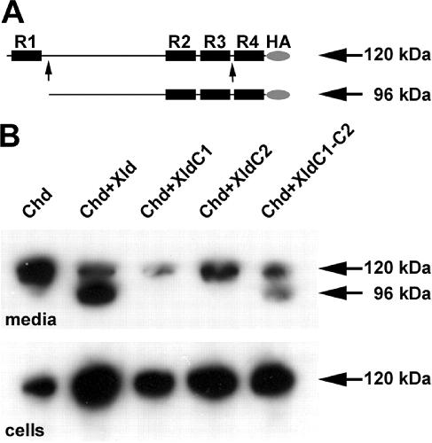 FIGURE 5. CUB1 and CUB2 are required for Xld to cleave Chordin. A, schematic