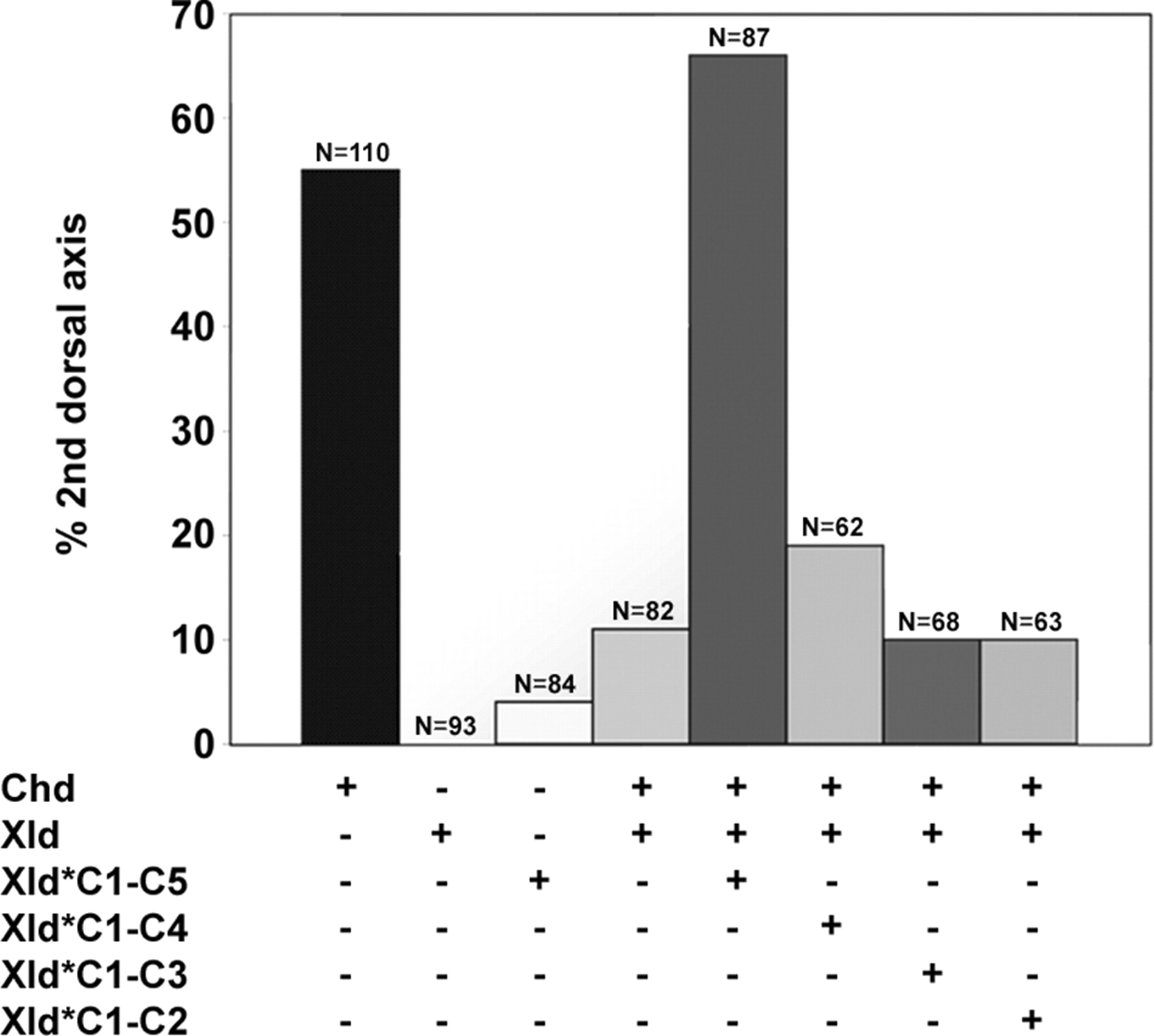 Chordin is blocked by coinjecting either xld (0%, n 77)(C), xldC1–C3 (0%, n