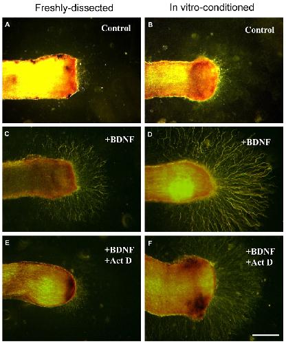 (A-F) Axonal outgrowth from freshly dissected (A,C,E) and in-vitro conditioned (B,D,F) PN-DRG. In vitro conditioned PN-DRG show enhanced BDNF-induced axonal outgrowth in the presence or absence of ActD. After 3 days in collagen gels, freshly dissected PN-DRG show limited axonal growth (A) that is markedly increased by BDNF (C) but not in the presence of ActD (E). In vitro conditioned preparations show slightly increased axonal outgrowth (B) that is greatly enhanced by BDNF (D), even in the presence of ActD (F). Note that not all axons are within the plane of focus. Scale bar: 200 μm.