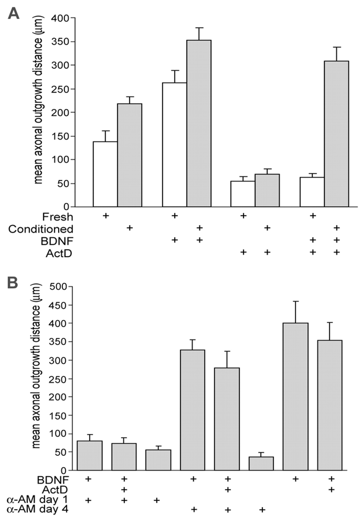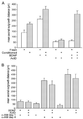 Transcriptional dependence of axonal growth. (A) Mean axonal outgrowth distances from freshly dissected and in vitro conditioned PN-DRG in collagen gels after 3 days, in response to BDNF in the presence or absence of ActD. Conditioned PN-DRG show enhancement of both spontaneous and BNDF-induced axonal growth. ActD inhibits BDNF-induced axonal outgrowth from freshly dissected preparations but not from conditioned preparations. (B) Effects of prior incubation with α-AM on subsequent BDNF-induced axonal outgrowth in the presence or absence of ActD. Preparations were incubated (free-floating) for 4 days with α-AM present on day 1, day 4 or not at all, prior to culturing in collagen gels for 3 days with or without BDNF. Incubation with α-AM on day 1 strongly inhibits subsequent BDNF-induced axonal outgrowth in collagen gels, but incubation with α-AM on day 4 does not.