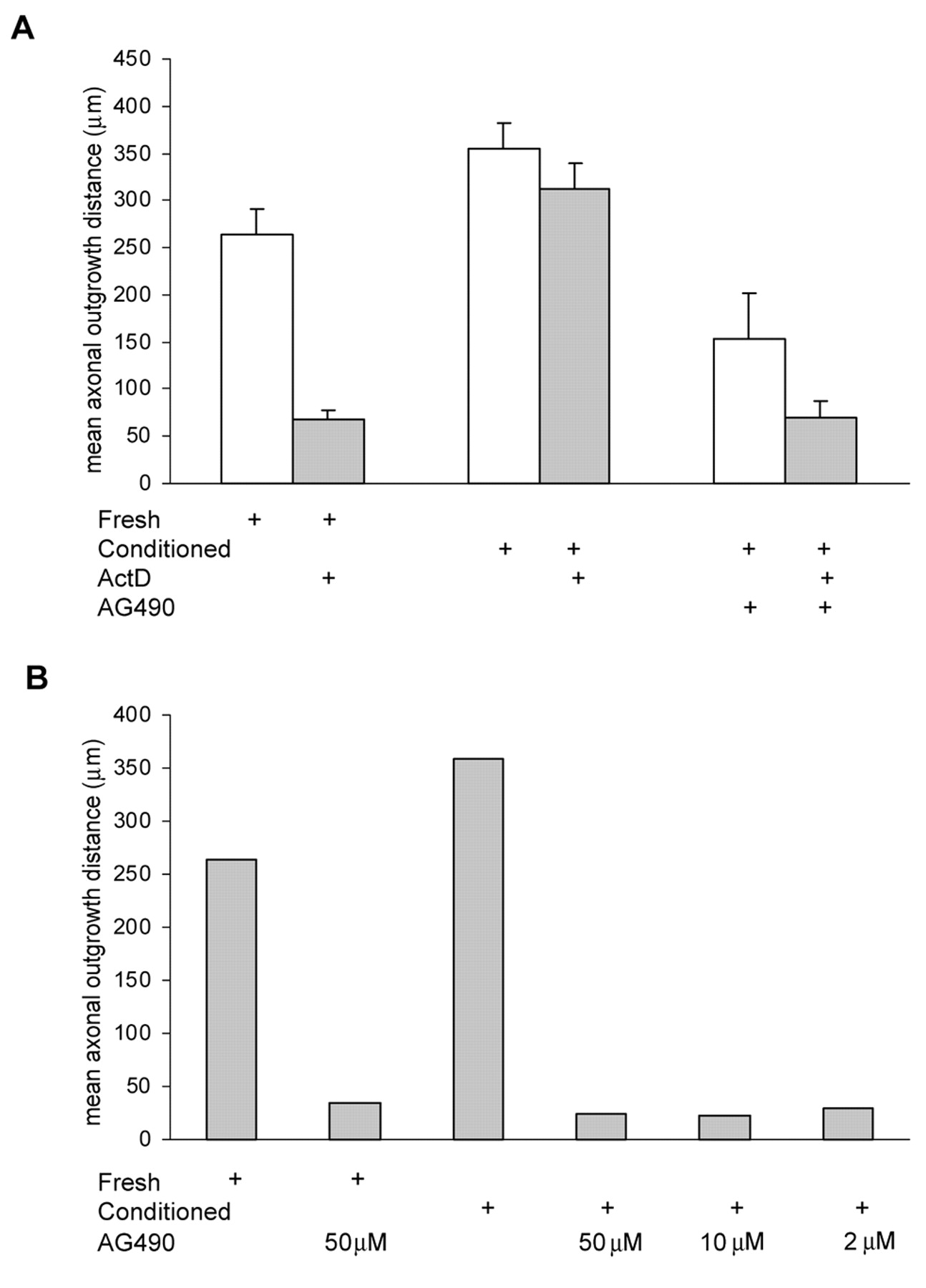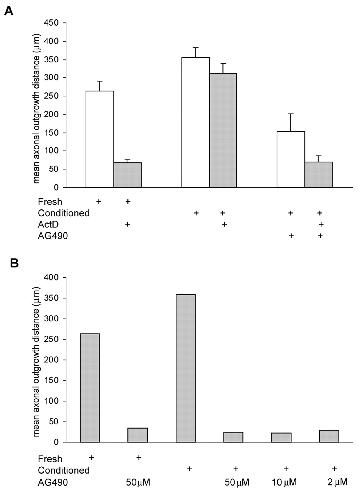 AG490 inhibits axonal growth in freshly dissected and in vitro conditioned PN-DRG. (A) Incubation of PN-DRG with AG490 (50 μM) for 3 days significantly reduced subsequent BDNF-induced axonal outgrowth in the presence or absence of ActD (P<0.001 or P<0.005, respectively). (B) However, BDNF-induced axonal outgrowth from both freshly dissected and conditioned preparations was also strongly inhibited in the presence of AG490 at concentrations as low as 2 μM (mean values from two pooled experiments).